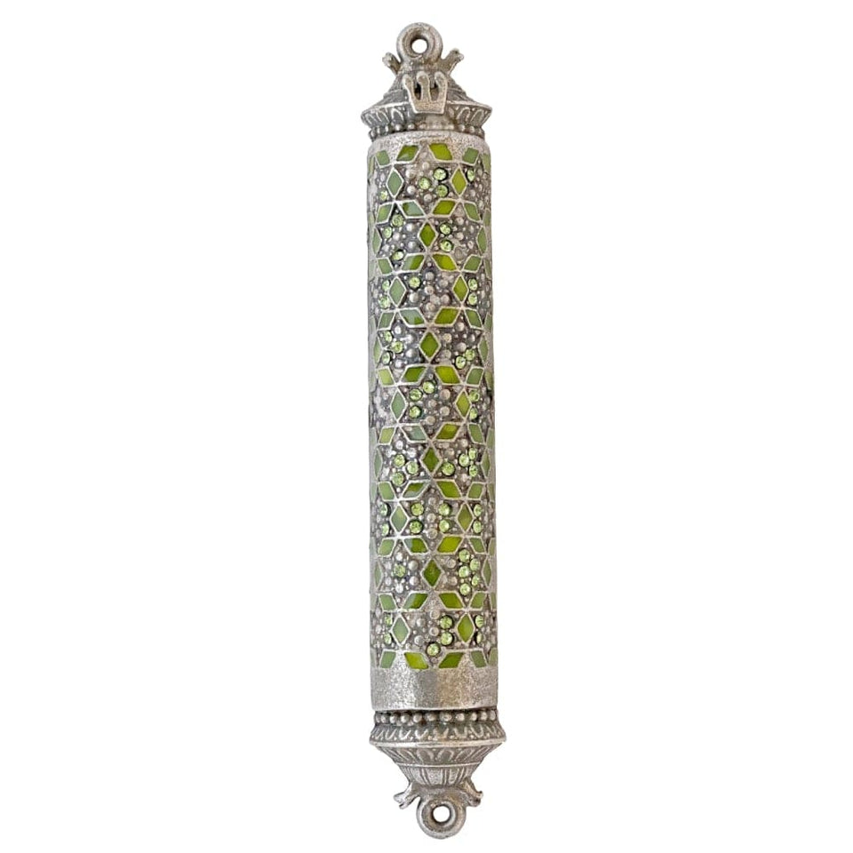A middle eastern style Mezuzah with small Magen David shapes formed by mosaic style borders. Each little Magen David is accented with sequin stones.