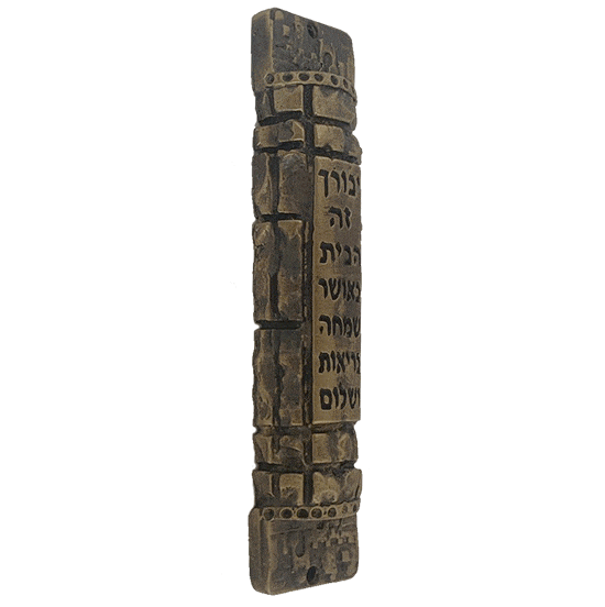 A prayer is written on the walls of Jerusalem. A blessing for a home full of wealth, happiness, health and peace. The homes of Jerusalem lie in safety behind the walls on this brass Mezuzah.