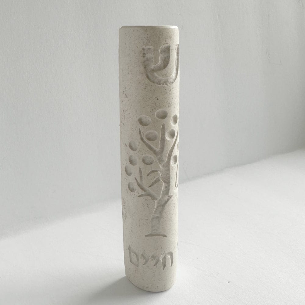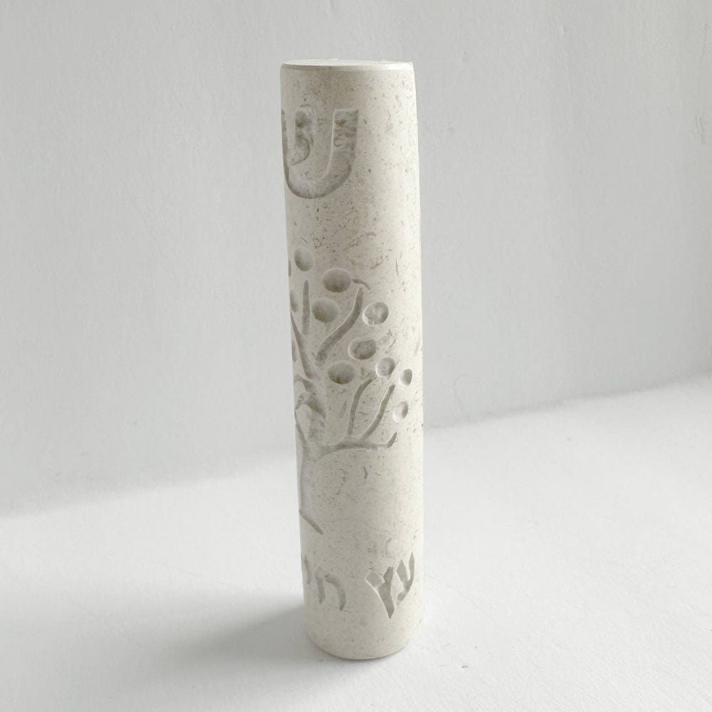 Please note that the color will vary on this product. Natural Jerusalem stone can range from off white to pink in color. Jerusalem Stone is a natural product and each Mezuzah will have unique surface characteristics such as differences in texture or cracks. These are characteristics of Jerusalem Stone and don't in any way compromise the strength, quality or beauty of the product. You can read more about Jerusalem stone here.